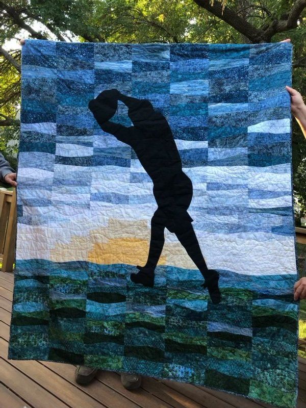 This quilt was of my son's best friend who passed away from cancer at the age of 22. I was inspired by a photo that was displayed at his wake. He play ultimate frisbee for the local college, this is a representation of him. The quilt was custom quilted, with his name and jersey number 13.